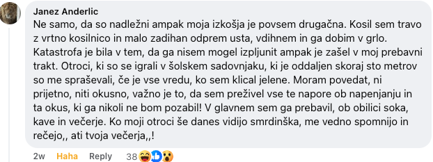 Janez je na enem izmed Facebook zapisov delil svojo nepozabno izkušnjo, kako se je med košnjo trave srečal s smrdljivcem na način, ki si ga nihče ne bi želel. Namesto da bi ga preprosto opazoval od daleč ali se trudil, da bi ga pregnal, je Janez, nič hudega sluteč, vdihnil smrdljivca kar medtem, ko je kosil travo. 😅